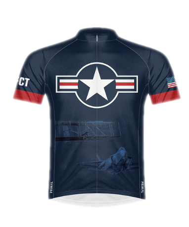 The two planes subdued into the jersey are not only beautiful, but represent our heritage and that of flight itself from the Wright Brothers’ 1903 Flyer to today’s multi-service F-35. From bike trails to contrails and beyond!