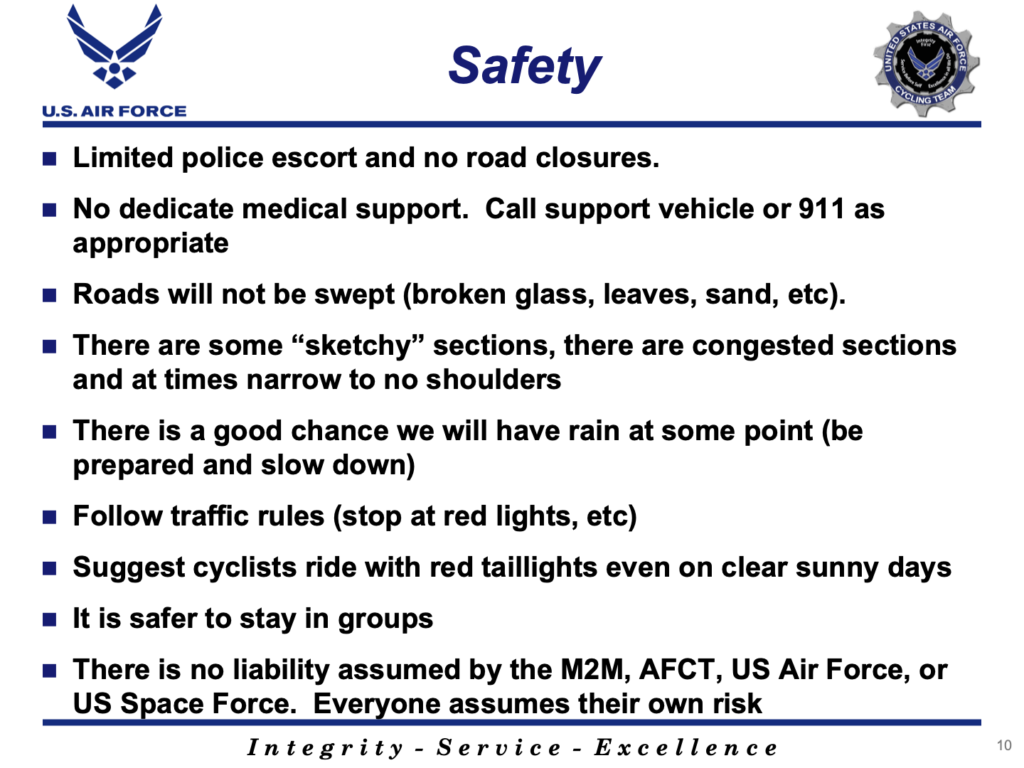 Neither the United States Air Force, nor the Air Force Cycling Team (AFCT) assumes any responsibility. Anyone joining the ride assumes their own liability